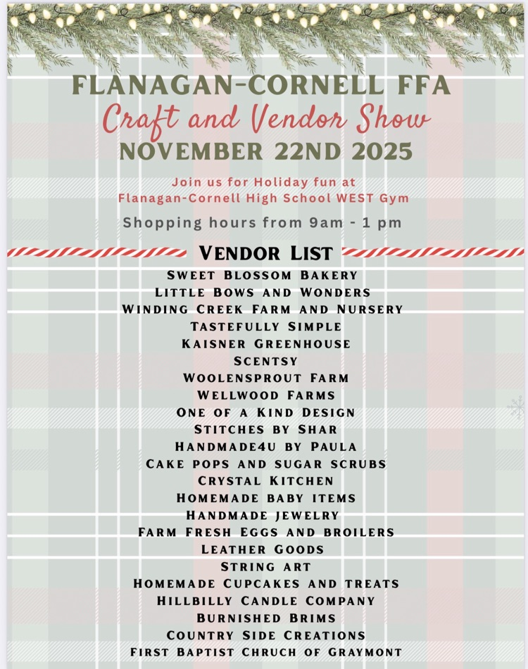 This Saturday is the FC FFA Christmas Vendor and Craft fair from 9am-1pm! This year we are having a hot chocolate bar! Come get a hot chocolate on us and shop! We have so many amazing vendors along with some of our own students! Hope to see you there!