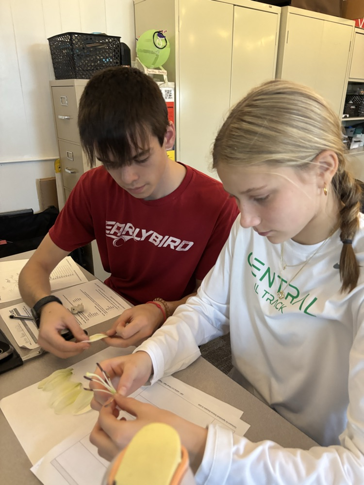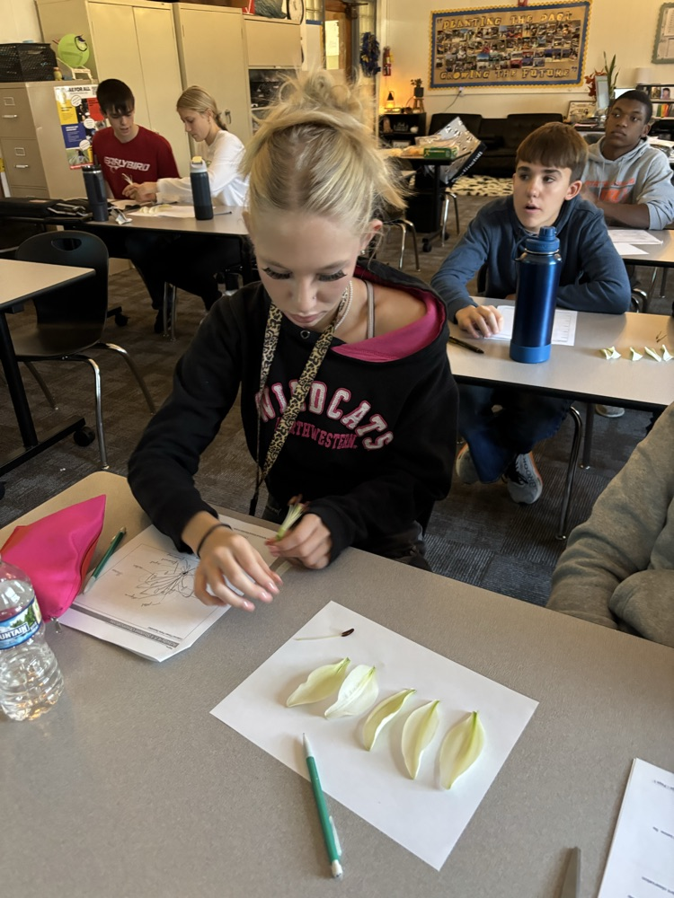 Students wrapped up their plant anatomy unit by dissecting flowers and identifying each part. They have now moved into monocots and dicots, where they observed plant stems under microscopes to compare the arrangement of vascular bundles.