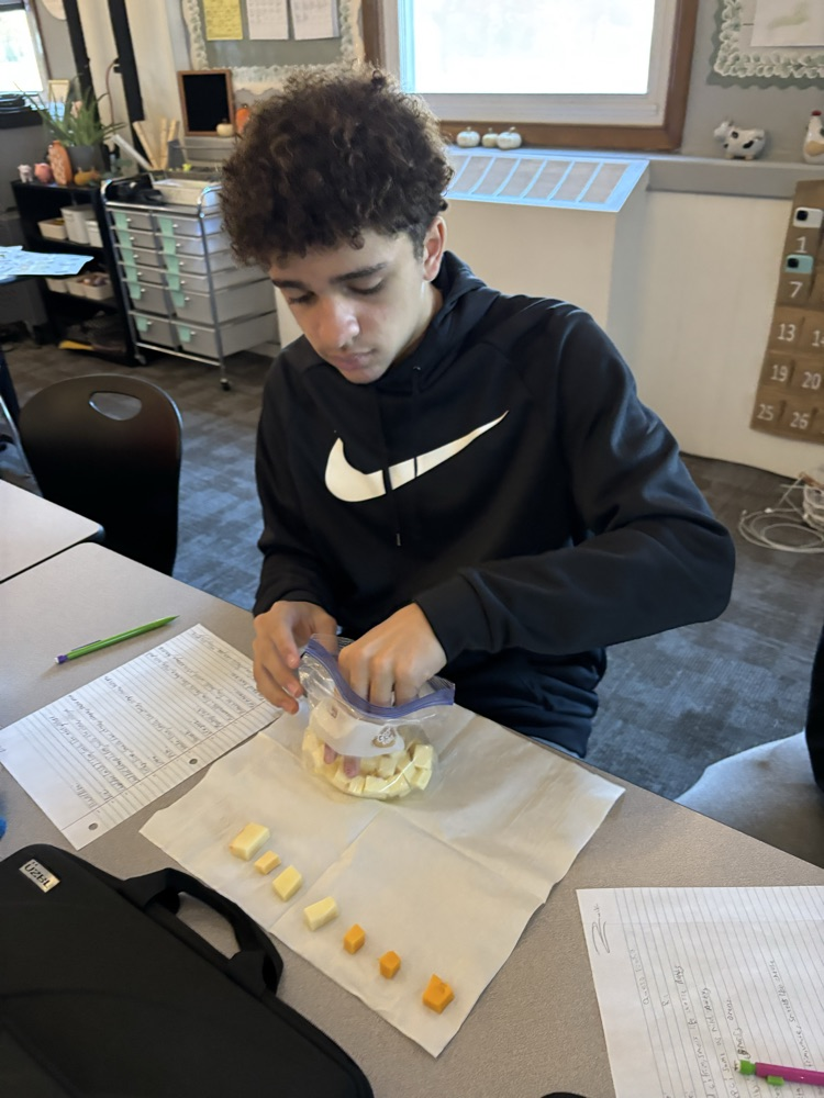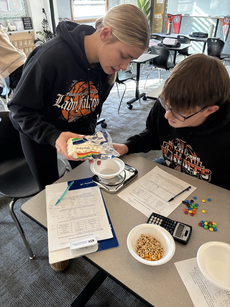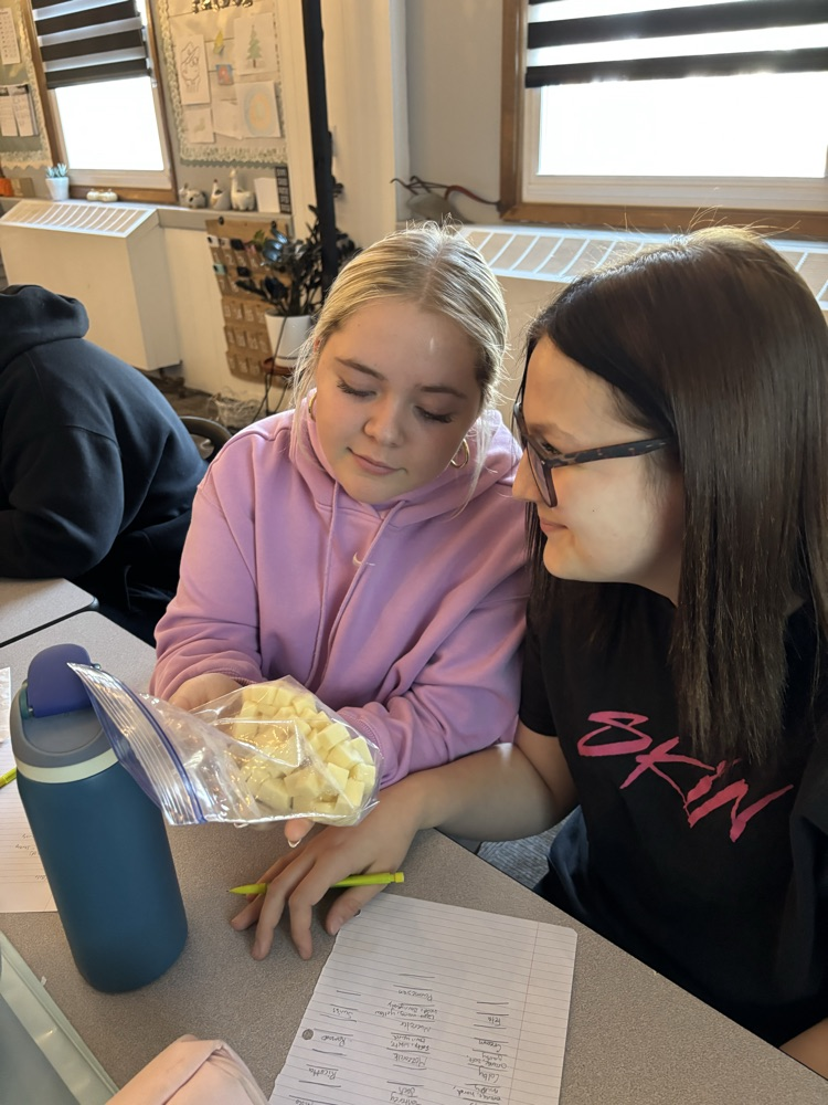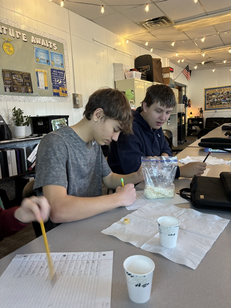This class has been hard at work studying nutrition, digestion, and feed rations. Students examined various feed components, comparing crude protein levels and dry matter content. They then applied their knowledge by building their own “feed” mixtures using the Pearson Square method to determine how much of each ingredient was needed to reach a desired protein level.